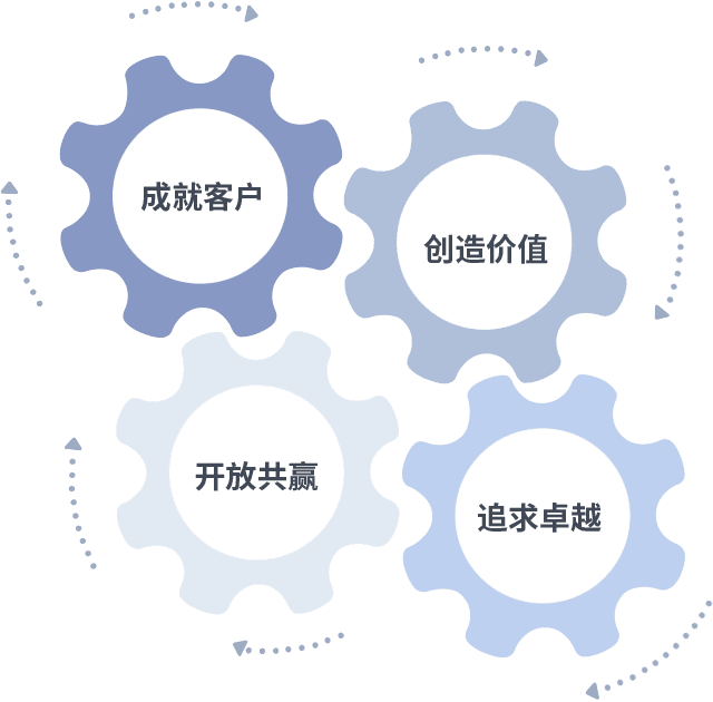 成就客户是一切决策的出发点,,创造价值是衡量所有工作的标准,,追求卓越是我们做事做人的态度,,,开放共赢是我们的格局也是最终的结果。。。。价值观的齿轮环环相扣,,推动着组织里的每个人不断向前。。。