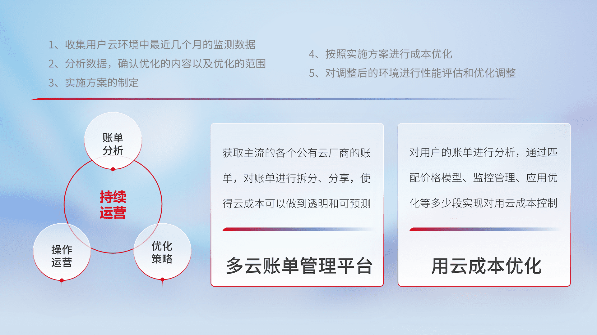 通过多云纳管,,,以统一的资源数据模型把客户的云资源进行抽象和封装,,进而实现对多云资源的统一操作,,,,保障云资源管理的可靠性、、稳定性与可用性。。量身定制化运维内容,,配置、、、、开发运维、、、、补丁管理、、、备份、、监控、、、认证和访问管理、、、审计和日常巡检等,,保障在用云过程中的可靠度,,,,稳定度以及高可用率。。。。